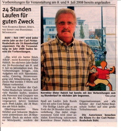 „ Das wird ein hartes Stück Arbeit“ so Konrektor Dieter Habich. Auch 2008 findet am 8. und 9.Juli im Jahnstadion wieder der 24 - Stundenlauf statt. Die Vorbereitungen bringen viele Aufgaben mit sich: Sponsoren suchen, Catering, Stromversorgung und Ablauf planen. Auch dieses Mal werden wieder T-Shirts und Plakate vorbereitet.