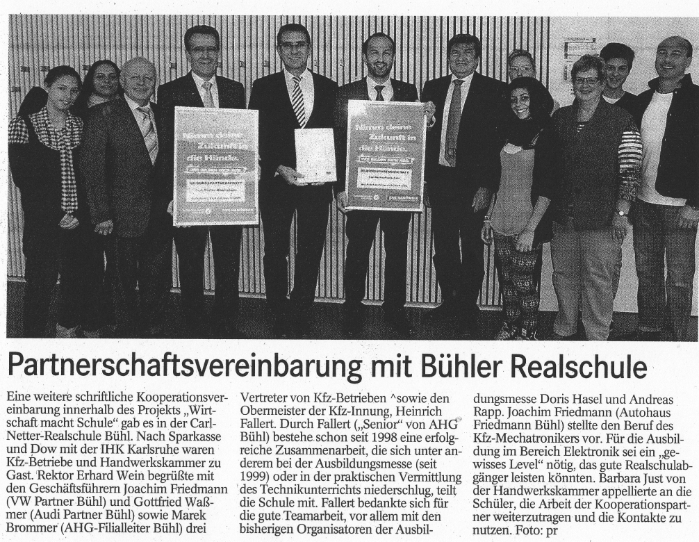 Partnerschaftsvereinbarung der Carl-Netter-Realschule mit Autohaus Friedmann und ahg Autohandelsgesellschaft Bühl