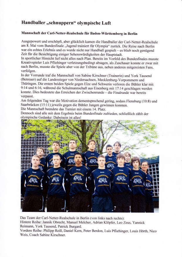 Unsere Jungen-Handballmannschaft qualifizierte sich für das Bundesfinale 2010 in Berlin und erreichte den 14. Platz beim Wettkampf “ Jugend trainiert für Olympia ”