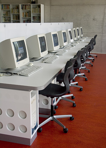 Alle PCs und alle Räume in sind miteinander vernetzt, d.h. ein Server im Serverraum (1.11) hält ständig alle nötigen Programme, Internetdienste und Speicherplatz für jeden angemeldeten Benutzer bereit. In jedem Raum der Schule gibt es eine Datensteckdose (markiert mit grünem Punkt), an die mittels eines Netzwerkkabels jeder Schul-PC und der Laptop angeschlossen werden können, um auf den Server zugreifen oder auch im Internet surfen zu können. Als Server dient ein DELL PowerEdge 2850: Intel Xeon Prozessor 2.80 GHz, 1 MB Cache, 800 MHz FSB; Arbeitsspeicher mit 2 GB Single Rank DDR2 Memory; 4 x 73 GB SCSI-Festplatte, 10.000 U/min; PERC 4e/Di onboard RAID Controller; 3.5 inch 1.44 MB Floppy; 8x DVD-ROM Drive; Gigabit- Netzwerkkarten (2 x Intel pro 1000) und das alles abgesichert durch eine USV (unabhängige Stromversorgung). Jeder Schüler hat einen Speicherplatz von 100 MB auf dem Server, jeder Lehrer einen von 300 MB.