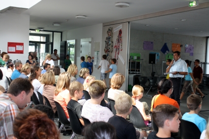 Nach einem selbsteinstudierten Tanz von Mädchen aus der Klasse 7c wurden die schon ungeduldigen Neulinge nicht weiter auf die Folter gespannt. Die fünf Klassenlehrerinnen Andrea Bechthold (5a), Lena Zeeb (5b), Katharina Peter (5c), Stefanie Sowa (5d) und Christiane Günther (5e) nahmen ihre Schützlinge in Empfang und verschwanden mit ihnen in den Klassenzimmern.