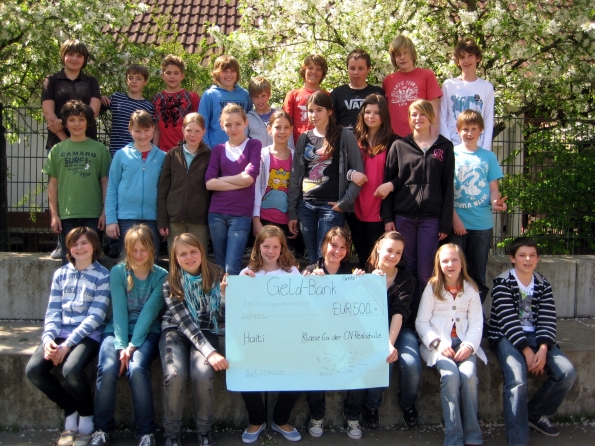 Den Erlös ihres SE-Projektes spendet die Klasse 6a für Hilfsprojekte in Haiti. Mit ihrem eigenen Taschengeld rundeten die Schülerinnen und Schüler den gespendeten Betrag auf 500 Euro auf.