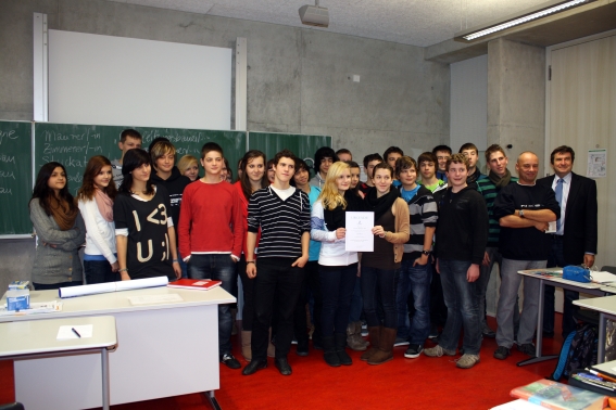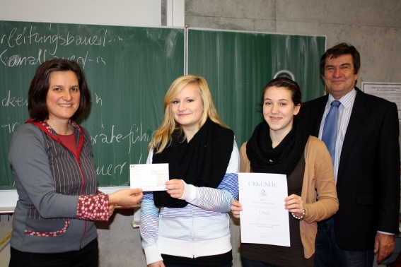 Am 26. Oktober stand für die Schülerinnen und Schüler der Technikgruppe „Berufsorientierung” auf dem Gebiet der Bauberufe auf dem Stundenplan. Mit ihrem Lehrer Reinhard Kempf wurden sie im „Lehrbauhof” umfassend über Ausbildungsberufe im Bauhauptgewerbe, das Hoch-, Tief- und Ausbau umfasst, informiert. In einem Quiz konnten sie ihr Wissen zeigen. Als „würdige” Gewinner bezeichnete Vanessa Charlemagne vom Berufsförderungswerk der Südbadischen Bauwirtschaft GmbH die Klasse 9c und überreichte den Klassensprecherinnen René Geller und Anna-Lena Ritter die Urkunde und den Gewinnscheck über 100 €.