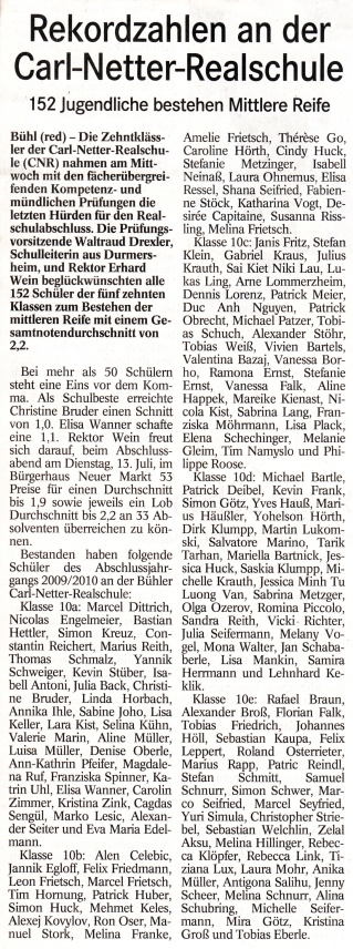 Bestanden haben folgende Schülerinnen und Schüler des Abschlussjahrgangs 2009/2010 an der Bühler Carl-Netter-Realschule: