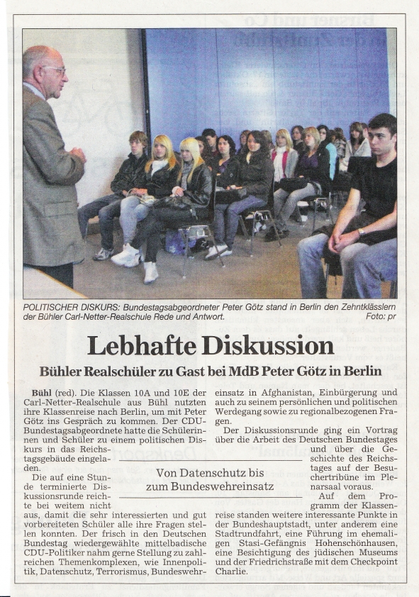 In diesem Schuljahr ging es am 28.09.09 bis 02.10.09 nach Berlin. Die Zehntklässler wurden dort im Reichstagsgebäude vom Bundestagsabgeordneten Peter Götz zu einer Diskussionsrunde eingeladen.