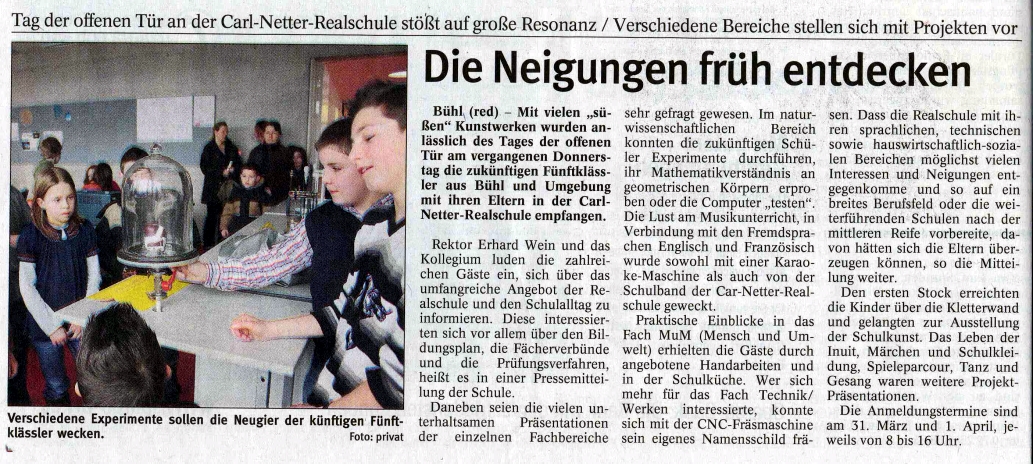 Am 5. März 2009 fand in den Räumlichkeiten der Carl - Netter - Realschule Bühl ein Tag der offenen Tür statt.